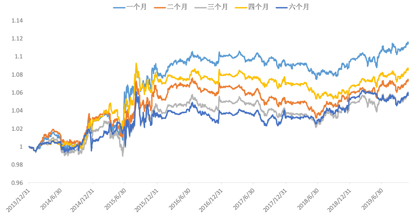 基于中证红利指数成分股构建再平衡方案,采用股息率加权,保持行业权重一致,测试1、2、3、4、6个月不同再平衡频率。回测期2014-2019年。