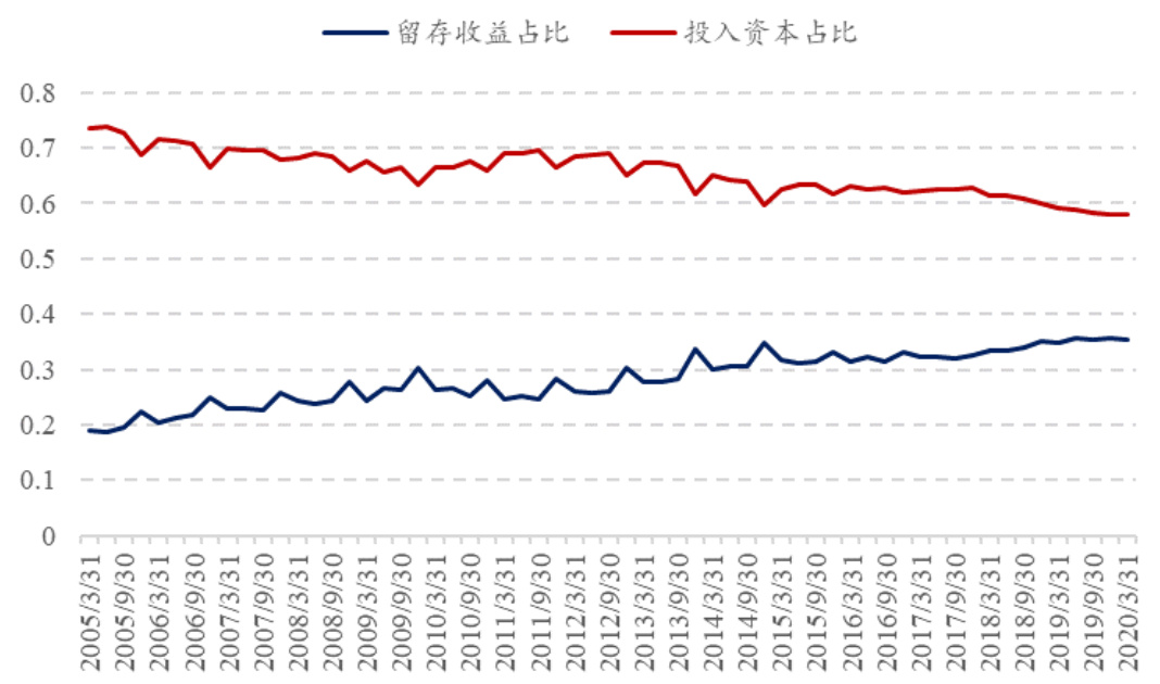 - 图表2 账面价值中留存收益占比和投入资本占比趋势
