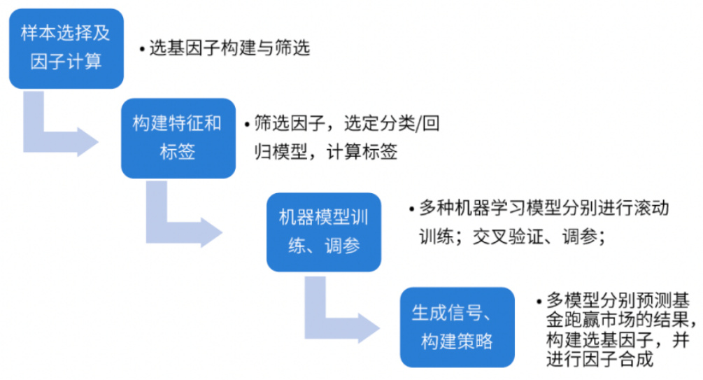 - 要点在于:构建基准基金池,计算多维度因子,采用机器学习模型训练与调参,生成选基信号,构建并回测策略。