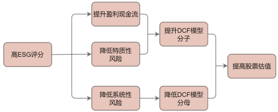 - 通过高ESG评分提升企业盈利现金流及红利预期,增加估值模型分子。