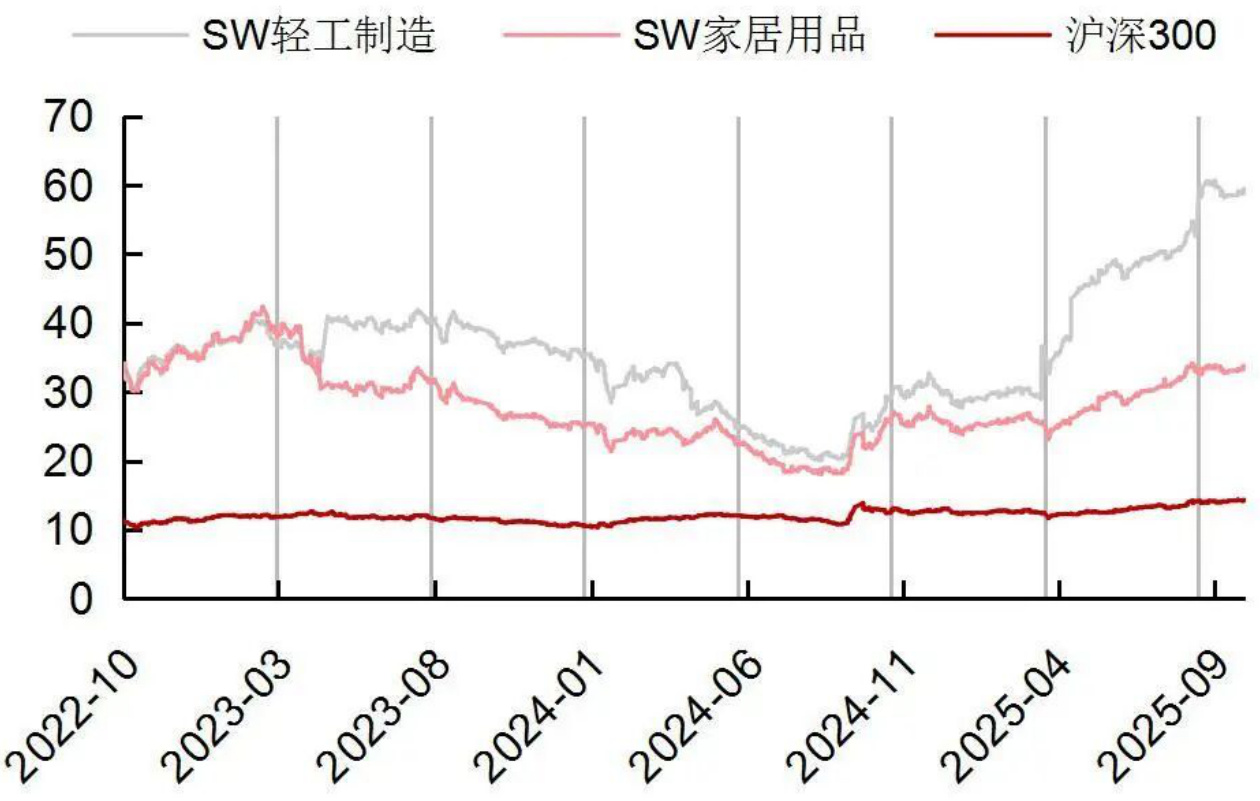 - 轻工制造及家居用品PE均呈现上升趋势,短期可能受消费回暖预期推动。