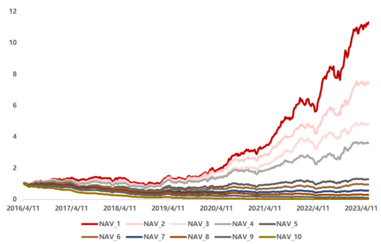 - 图19、20:IC波动幅度更大,累计IC余额显著提升,十组净值分组上升趋势明显,证明DLEM因子有效性提升。