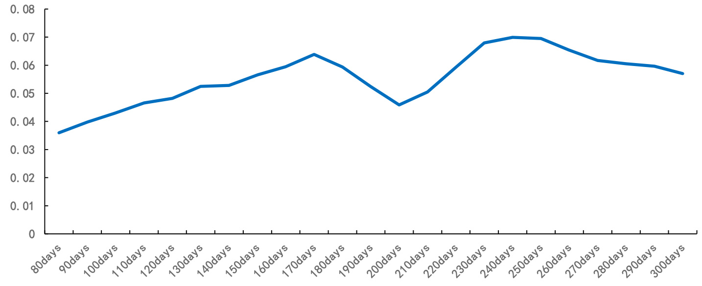 显示不同时间窗口(80-300天)简单区间收益动量的rank IC,发现在区间加长时动量因子表现增强,峰值约0.06,但波动较大,说明单纯用累计涨跌幅预测能力有限。[page::3]
