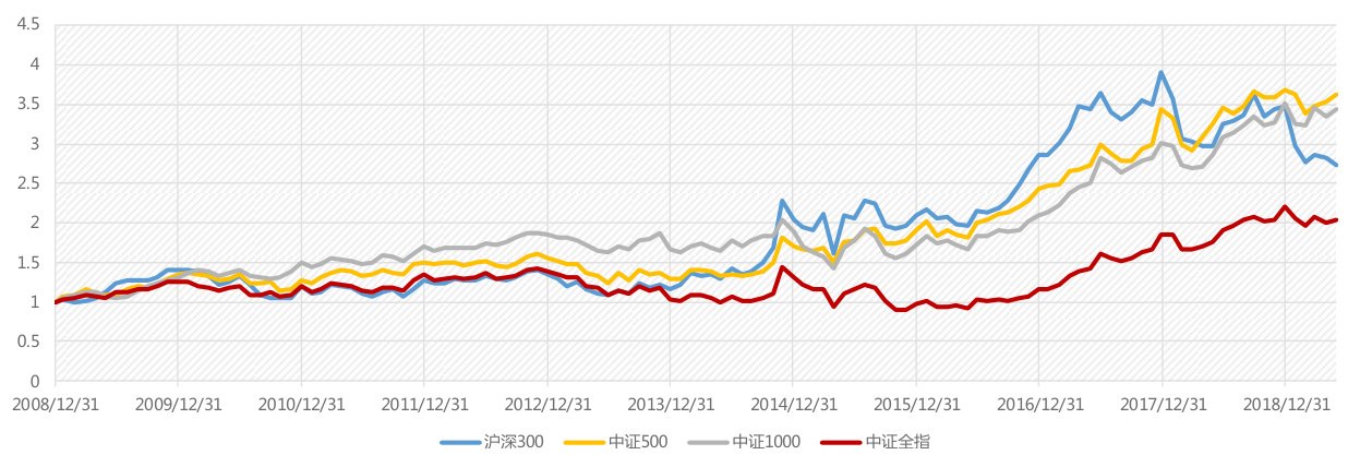- 绩效回测:从2009年至2019年6月,在沪深300、中证500、中证1000和中证全指四大股票池中的表现: