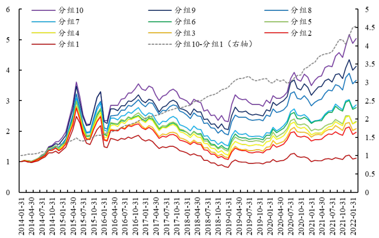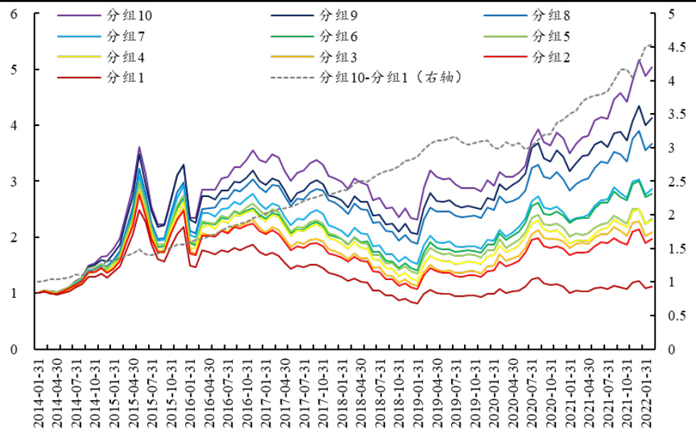 - 展示2014-2022年间按因子值分组的股票组合累积收益,10组最高组优势明显,分组10与分组1之间差距逐步扩大,多空对冲净值持续攀升,体现因子强劲alpha信号。