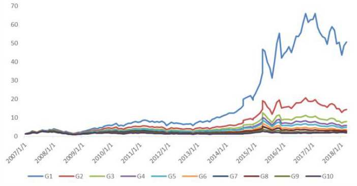 - 回测策略: 将全部A股按照股票当前市值排序,等权分成10组;买入最小市值组(G1),卖出最大市值组(G10),持有20个交易日,剔除停牌、涨停股票。