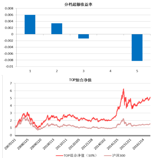 - TOP组合净值曲线显示超额收益的累积增长明显,平均年化收益31.36%,远超中证全指7.52%,体现了因子选股效果。