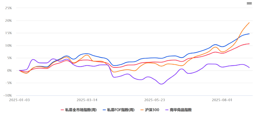 - 私募整体市场指数累计收益率显著跑赢大盘指数。