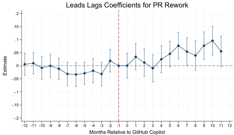 Copilot上线前后12个月PR返工率的事件研究系数图(带95%置信区间)。红色竖线为事件发生点(Copilot发布)。