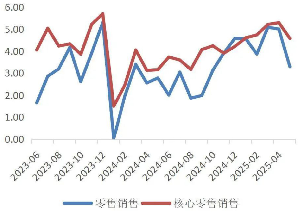 - 5月零售销售同比增速放缓至3.29%,核心零售增速同样下降。