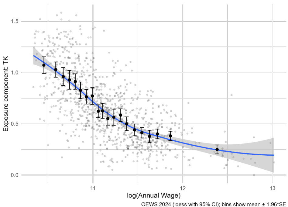 - 工资与自动化暴露呈正相关,揭示高薪职业普遍面临更高的自动化风险。