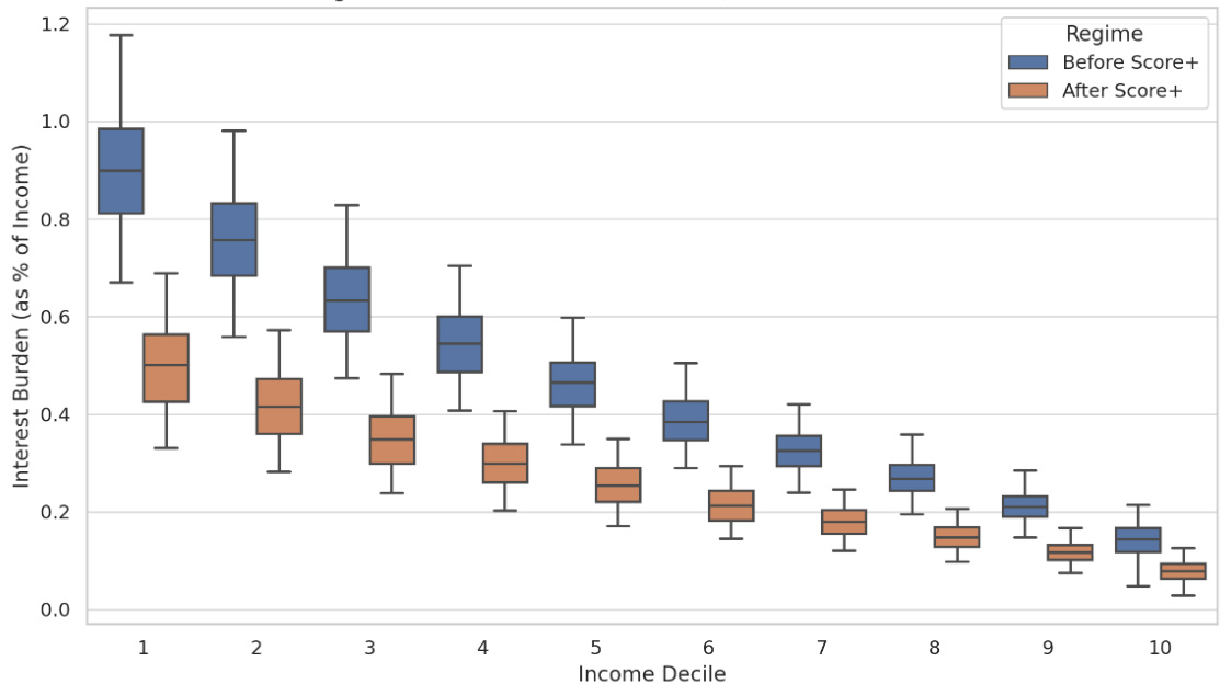 - 描述:Score+实施前后,利息负担(占收入比例)在各收入十分位的变化,呈箱型图。