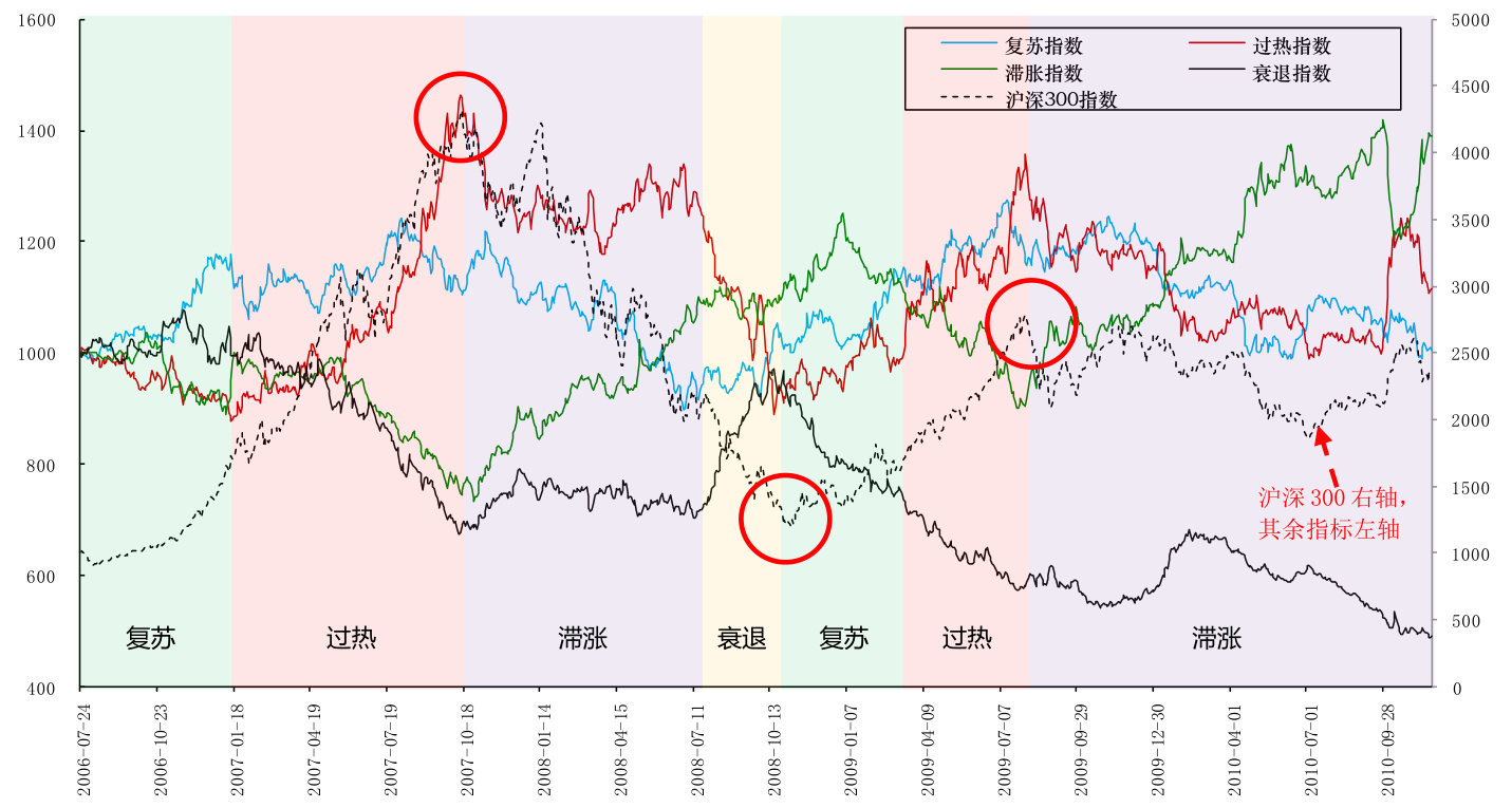 - 展示复苏、过热、滞涨、衰退四个指数随时间的变化规律,与沪深300指数走势同步体现市场牛熊周期。