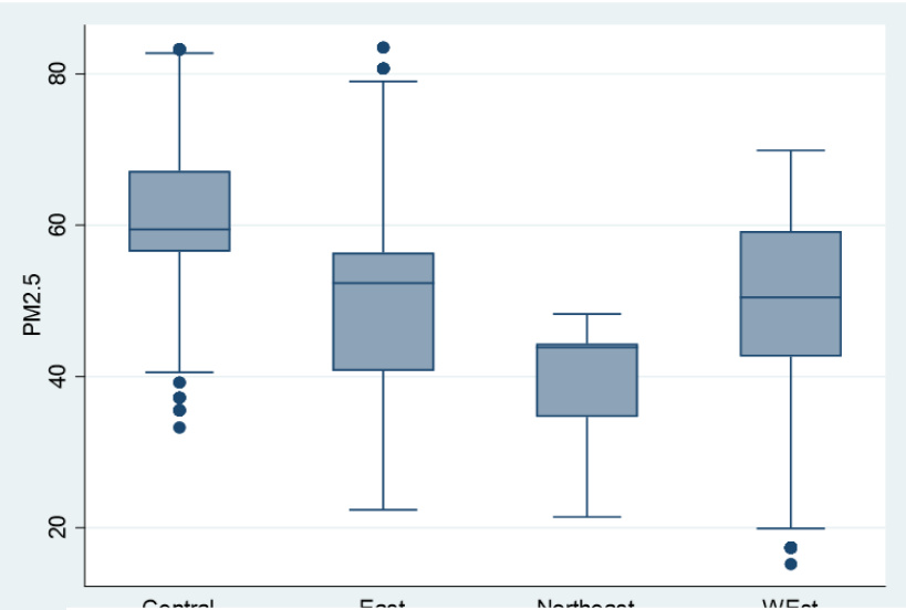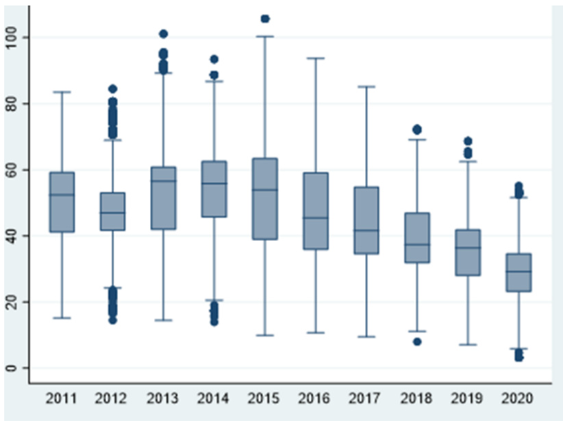- 描述:2011-2020年上市公司环境绩效(PM2.5浓度)的箱线图,表现其时间变化特征。