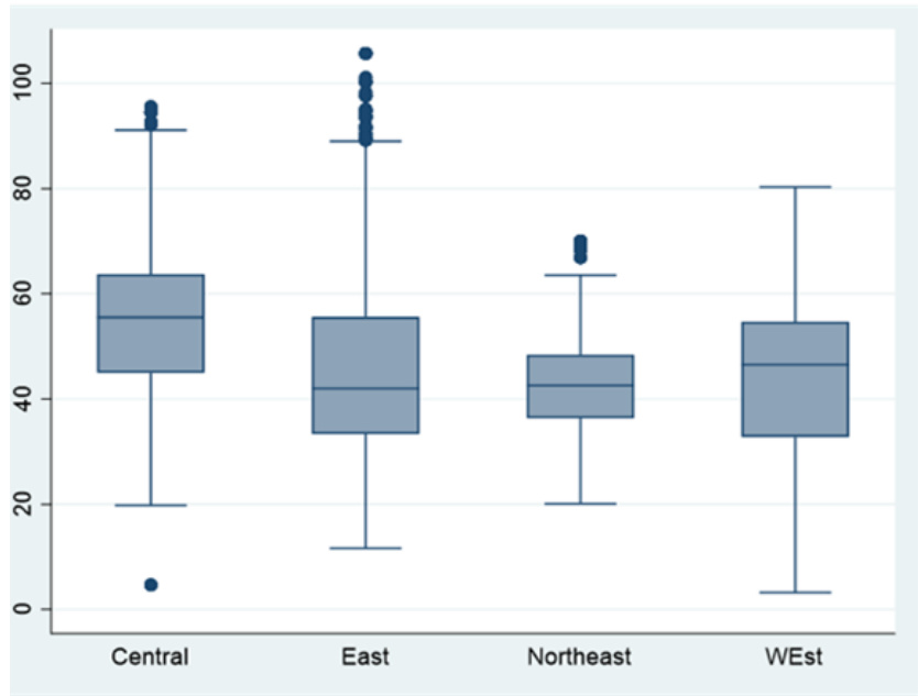 - 描述:比较中国东部、中部、东北和西部区域企业环境绩效分布。