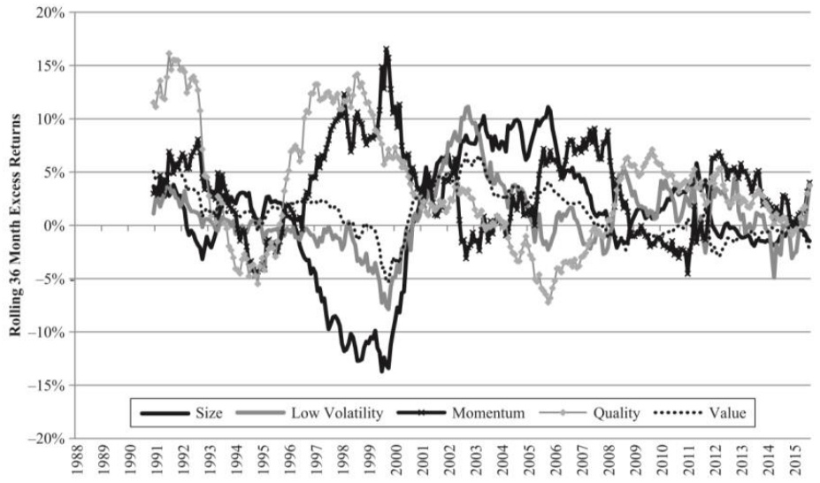 展示1991-2016年MSCIFactor指数与MSCI世界指数的36个月滚动超额收益,显示价值、规模、动量、质量、低波动因子的收益波动剧烈且周期明显。体现因子效应显著时段性且回报具有“风格轮动”特征,具有挑战择时实操。 [page::3]