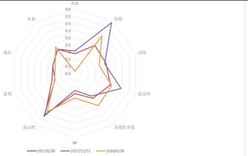 - 图4:2016年末至2017年末公募基金持仓风格,展现市值、贝塔、动量及其它因子暴露变化。