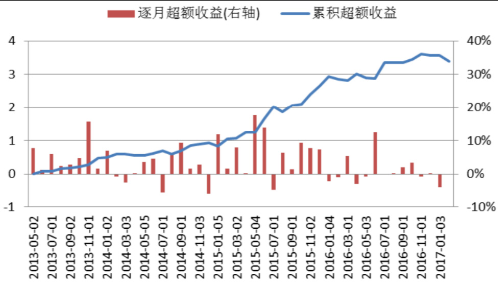 - 组合回测(2013.5-2017.1)累计超额收益339%,年化超额收益48.4%,最大回撤5.97%,月度超额胜率73.3%。