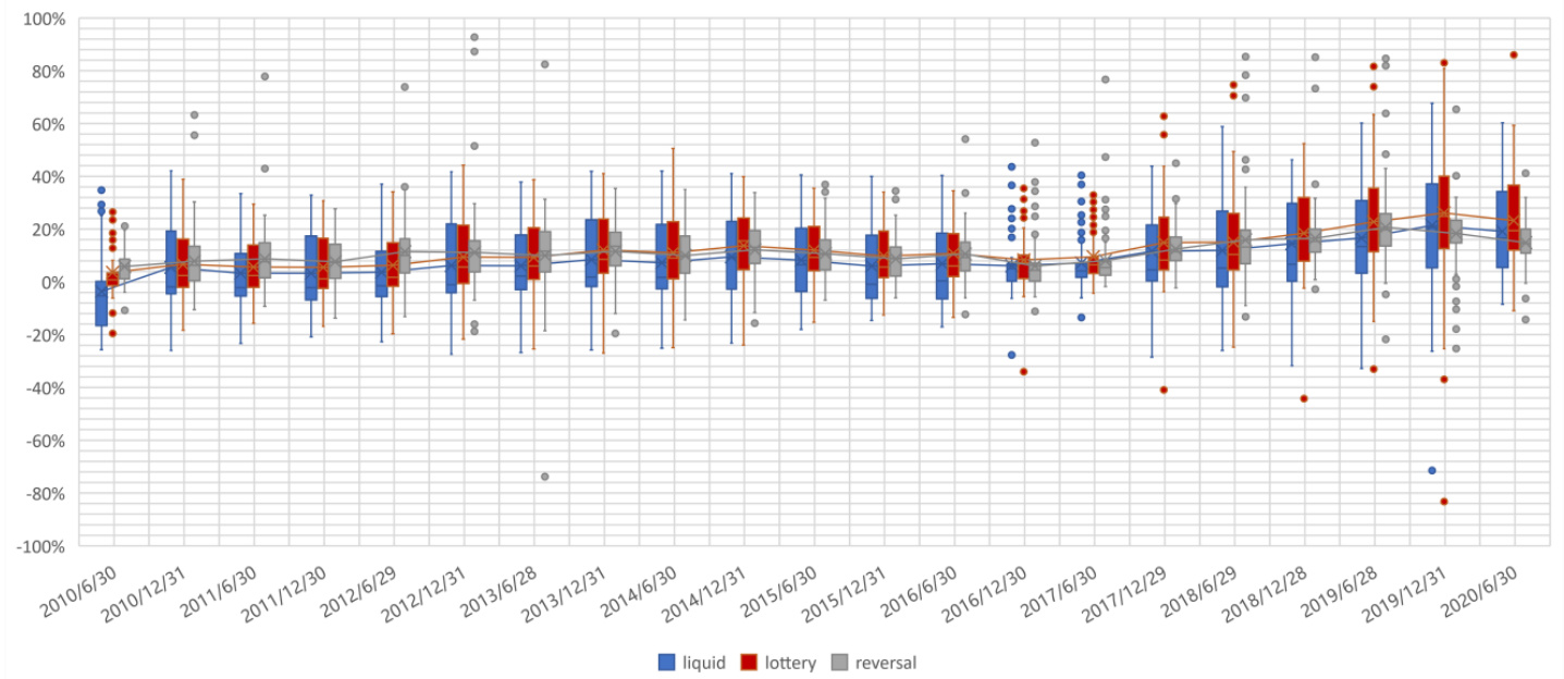 - 箱线图形式展示机器因子与传统技术因子中三大类(流动性、反转、投机)相关性分布。
