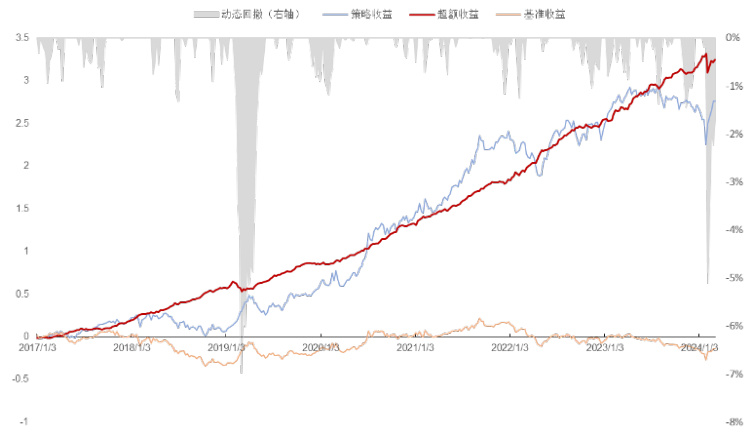 - 净值走势稳健,策略收益超过基准且动态回撤波动相对有限