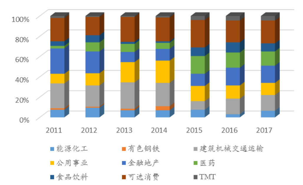 - 2013-2014年金融地产配置下降,2015年后回升,食品饮料和医药行业配置显著提升,2017年TMT行业配置也有所增加,体现行业配置随经济结构转型与政策导向不断调整。