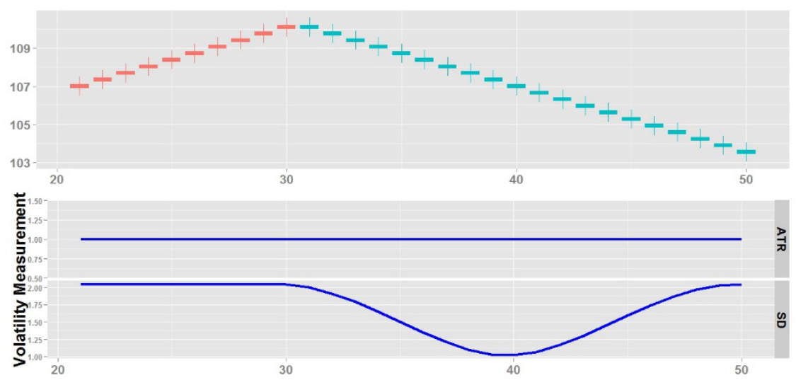 - 情境1:盘整向上趋势转化(图1),ATR保持较高稳定值,能及时反映趋势转变的活跃波动,而SD响应迟缓,需等待完整窗口后才反映趋势扩展的波动增大,表现平滑不足。