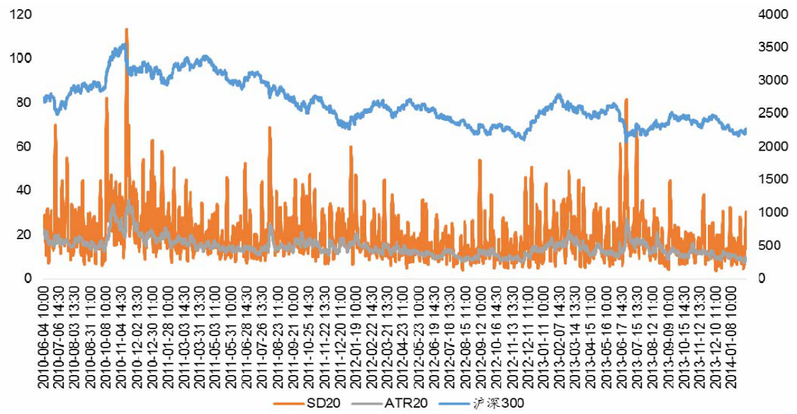 - 描述:图5呈示沪深300指数走势(蓝色)与30分钟K线下的SD(橘红色)和ATR(灰色)波动率序列;