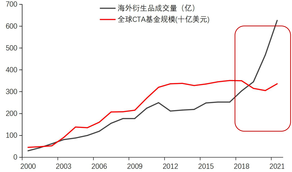 - 全球及国内衍生品成交量与CTA基金规模对比,海外市场衍生品成交迅速增长,CTA规模稳定,拥挤缓解,国内却相反。