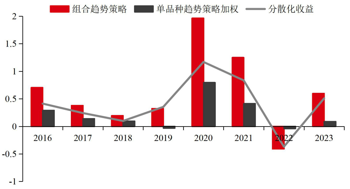 - 国内情况:底层多为商品资产,分散化效用略逊全球,分散效益乘数约为2-3(图12)。2022年,整体分散性收益为负,说明趋势策略组合表现不如部分单品种,宏观大年中组合效益被扰动。2023年分散收益回正。