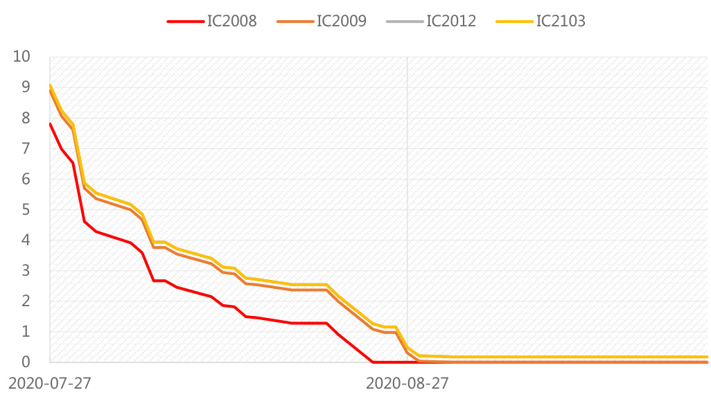 - 各合约表现为逐步下降的剩余分红影响,7月底开始对远期合约分红影响递减,但短期合约保持较高点数。