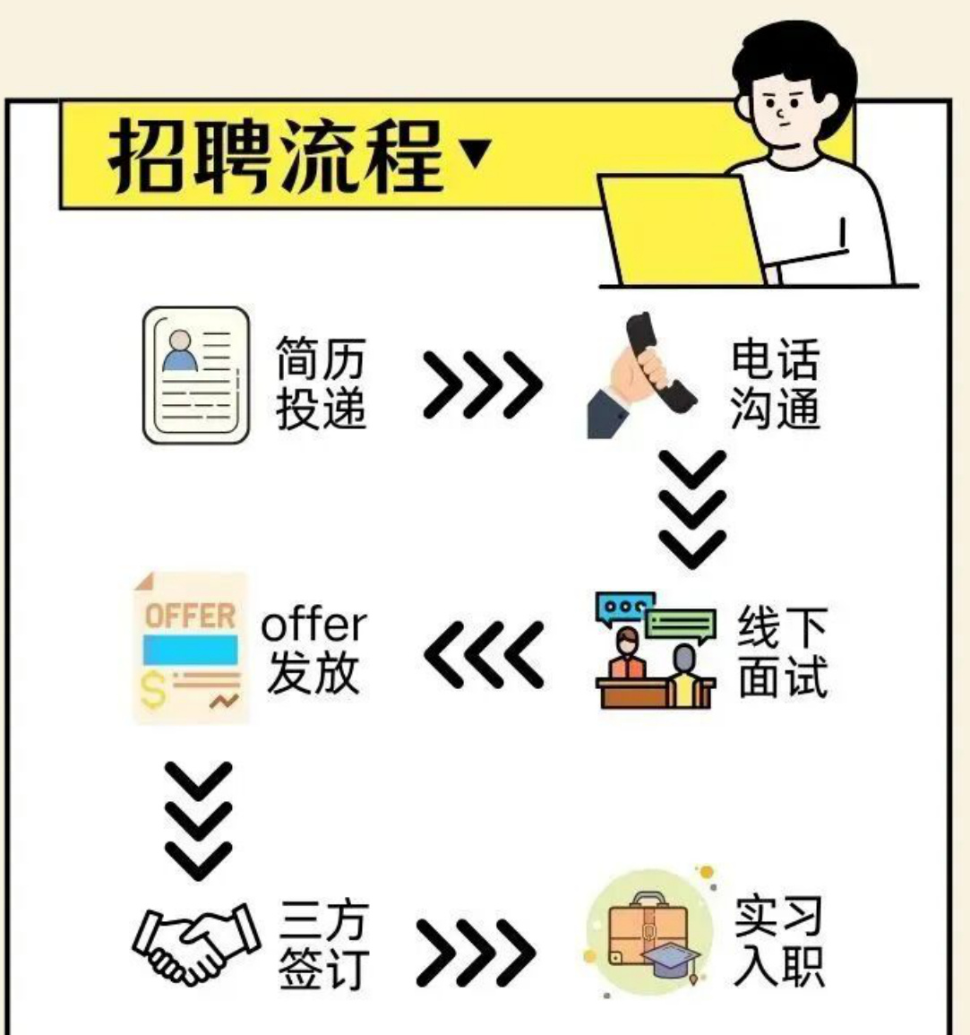 - 简历投递 → 电话沟通 → 线下面试 → offer发放 → 三方签订 → 实习入职