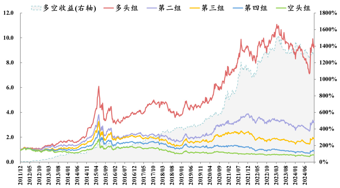 - 多头年化收益14.2%、多空组合年化15.1%,信息比率1.143。