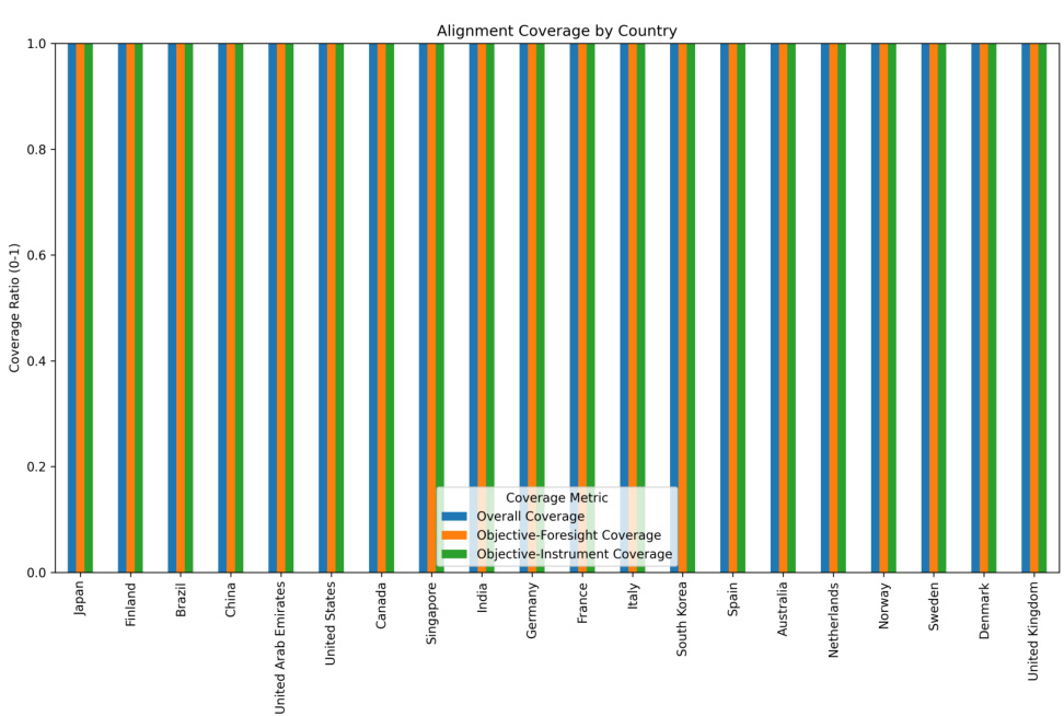 - 三矩阵(目标-实施工具、目标-前瞻方法、前瞻-工具)客观量化各政策组件对齐强度。