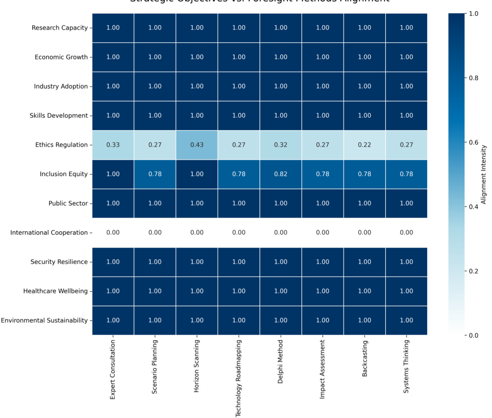 科学领导目标与专家咨询法对齐最强,伦理规范与参与式前瞻(如研讨会)对齐较弱,体现伦理议题在前瞻方法的整合上仍有欠缺。国际合作目标无明显前瞻方法匹配。