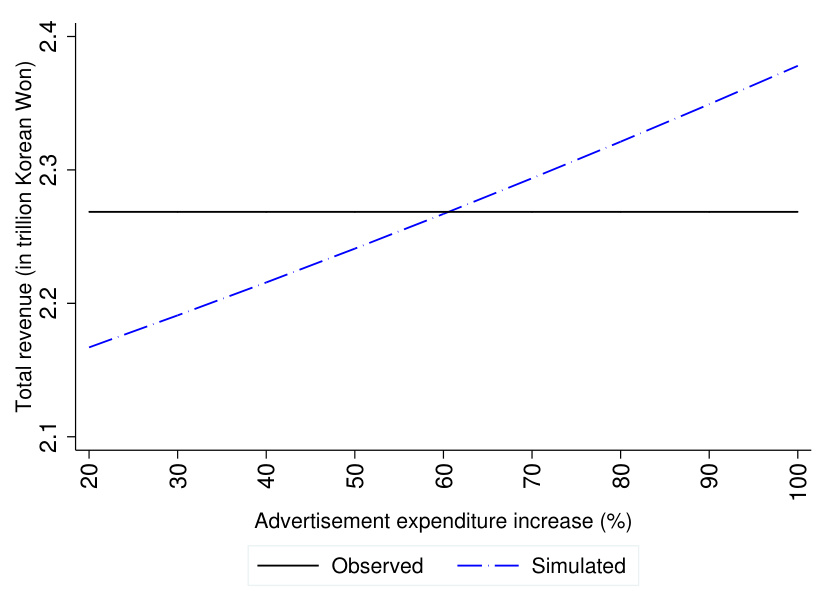 - 设计反事实:将Ottogi企业形象评分替换成3个竞争对手平均得分,模拟销售和收入的变化,价格保持不变(政府价格管制背景)。