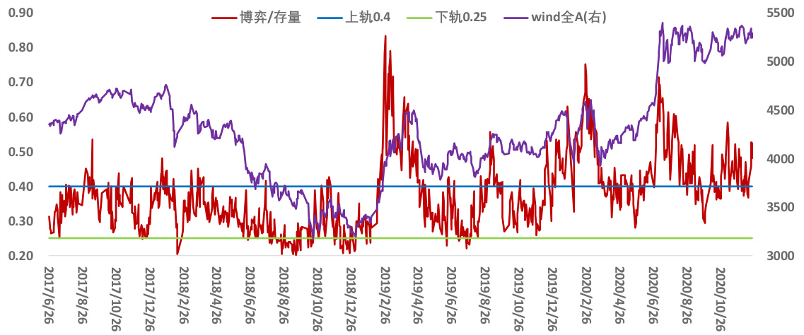 - 描述市场博弈强度,指标较常数0.4上轨波动,近期达到较高水平,代表市场参与者博弈增强。