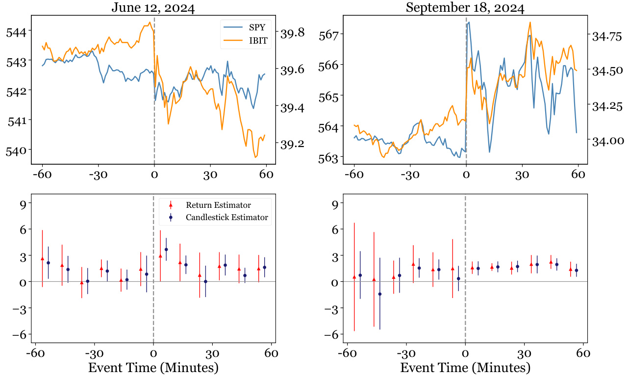 核心论点:传统基于高频开收盘收益的即时协方差估计存在统计准确性和局部信息获取的权衡。本文创新地引入利用高频蜡烛图信息(开、高、低、收价格)以解决此权衡问题的估计方法。该方法在保证估计的局部结构的同时,显著提升统计效率和推断能力。作者还开发了基于该方法的假设测试框架,验证其实用性,并通过对2024年市场数据的经验分析揭示了比特币信托ETF (IBIT) 的非市场中性表现,对金融事件(如FOMC公告)的响应能力优于传统方法[page::0,1]。