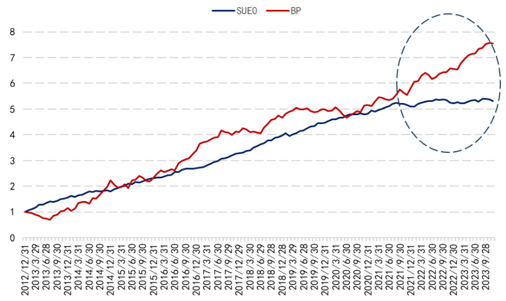 图表2则通过净利润超预期因子(SUE0)和价值因子(BP)的IC累计走势背离,强调alpha因子的收益波动和价值风格波动的相关性,暗示风格化趋势明显。[page::5][page::6]