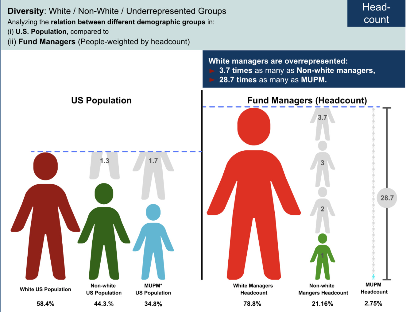 - 展示内容: 以拟人化图形对比美国人口与基金经理群体在白人、非白人及MUPM的比例(按人数计)。