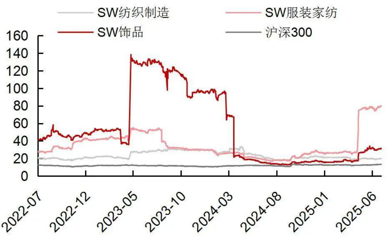 - 服装家纺、饰品PE-TTM处于高位,显示投资者对这两个子领域增长预期高企。