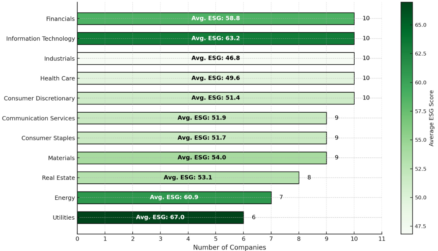 - 公用事业、能源和房地产等行业公司较少(分别6-8家),且这些行业ESG得分相对较高(公用事业最高,平均ESG 67分)。