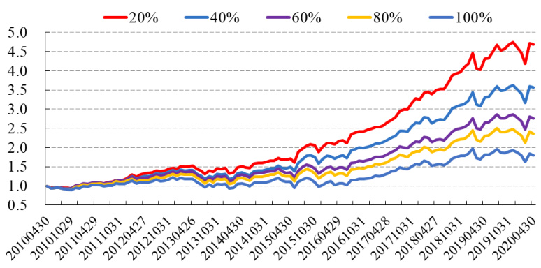 - 图4显示随着价格切割比例λ由100%逐步减少至20%,高价振幅因子Vhigh的IC均值绝对值和ICIR绝对值明显提高(IC均值从约-0.035提高到-0.062,ICIR从-0.77提升到-1.76),负向选股能力显著增强。