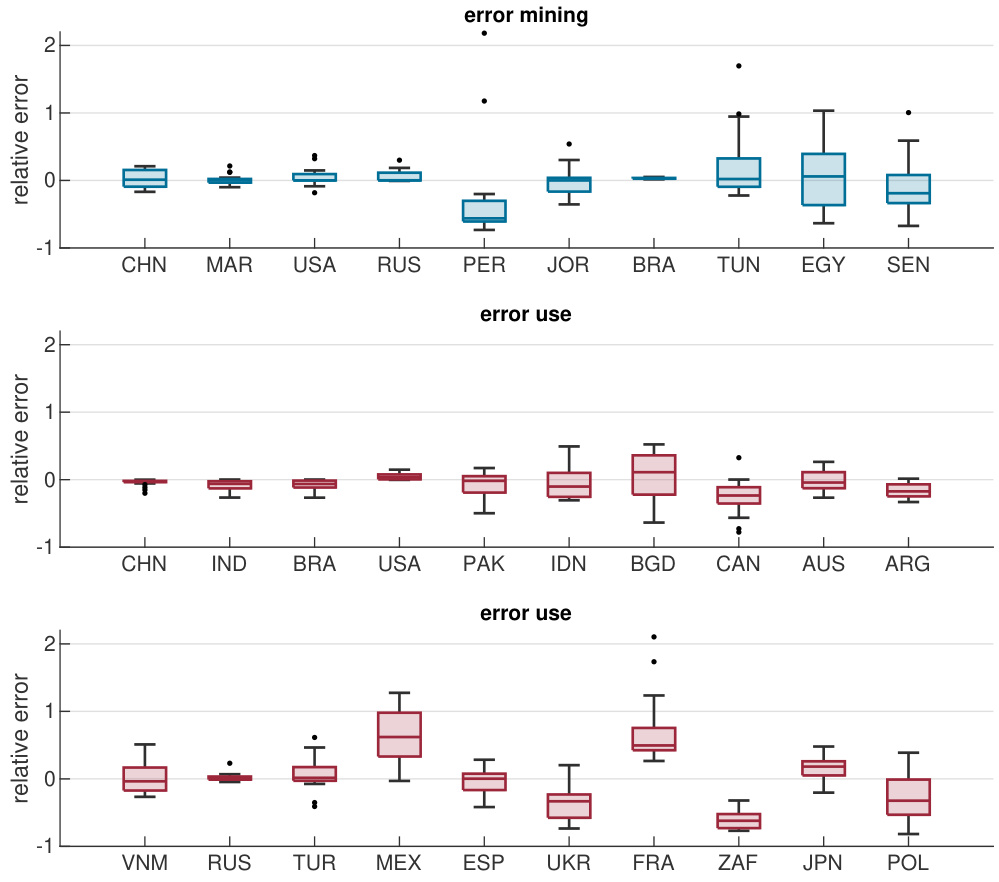 - 测量估计误差及拟合结果(附录图13),体现在主要矿产国及肥料使用大国上的误差分布。