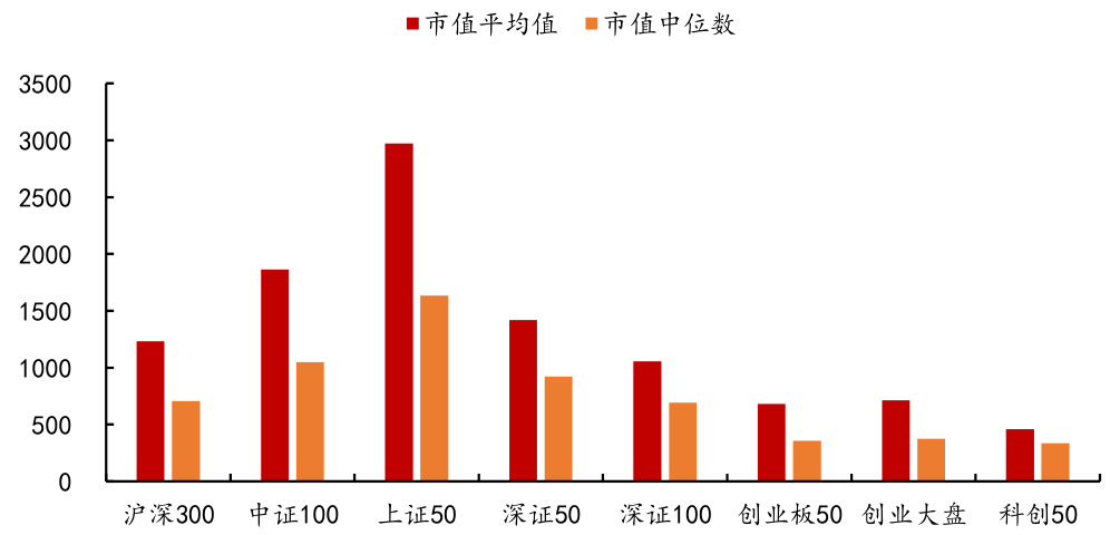 - 图示通过柱状图直观展示沪深300、上证50等指数流通市值均值与中位数对比。上证50的均值约3000亿元,远高于其他指数,显示成分股总体市值最大。